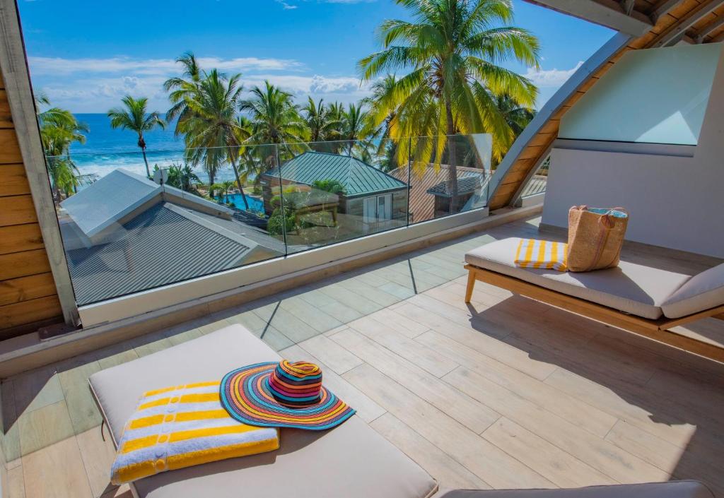 Cinq catégories de chambres avec douche italienne. La Cosy (20m2) vue jardin et balcon, la Supérieur avec douche (20m2) ou baignoire (30m2) toutes deux avec balcon, la Tropicale jacuzzi (30m2) avec varangue, la Deluxe (30m2) avec balcon, vue mer et cocotiers et l'Océan jacuzzi (30m2) avec varangue.