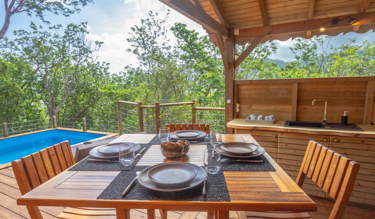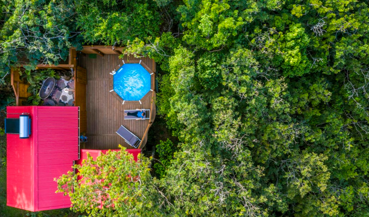Concept écolodge, hébergements nichés en pleine nature tropicale, certains offrant piscine privative et architecture cabane.