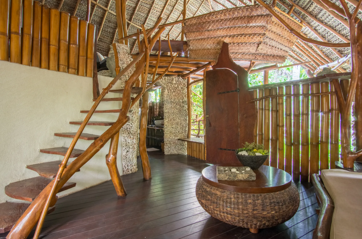 Ces bungalows de front de mer à deux étages disposent d'une terrasse extérieure abritée et d'un accès exclusif à la plage, avec une vue spectaculaire sur le jardin alentour et la mer. Selon le type de bungalow, ils ont la capacité d'héberger entre 2 et 4 personnes, avec des alternatives de lits queen-size ou de deux lits individuels. Dans la disposition normale, un lit de taille queen occupe l'espace à double hauteur au rez-de-chaussée, tandis que deux lits individuels sont disposés dans la mezzanine qui est accessible depuis l'étage. On peut accéder à la salle de bain personnelle depuis les zones communes situées au rez-de-chaussée.