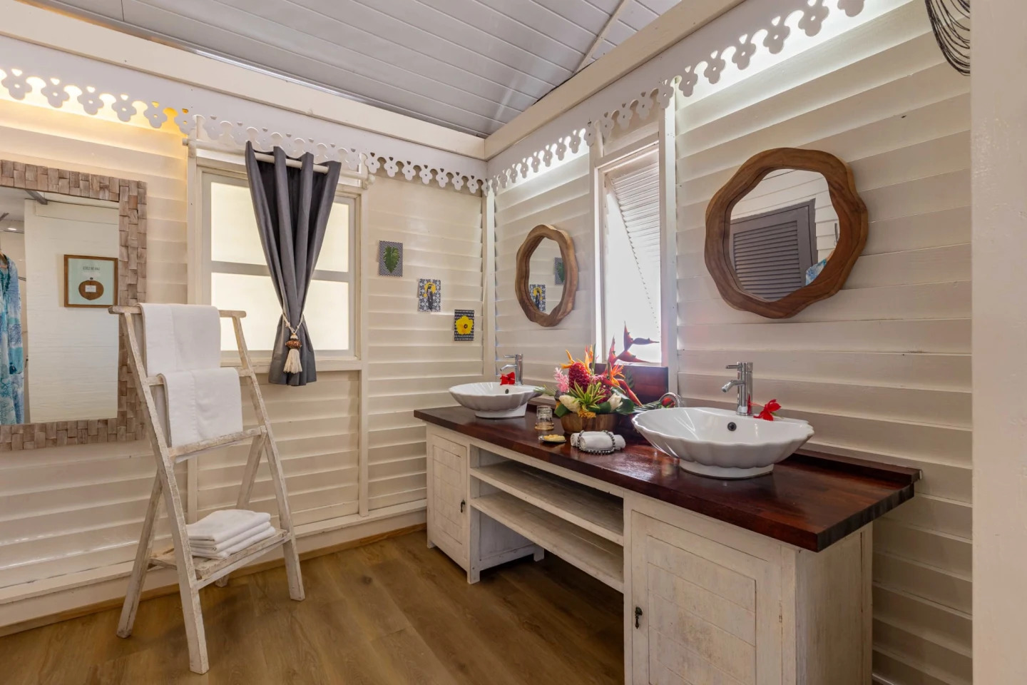 D'une superficie similaire d'environ 50 m², le Bungalow Plage/Lagon peut également accueillir jusqu'à 3 personnes (3 adultes ou 2 adultes et 1 enfant). Son atout majeur est sa vue magnifique et directe sur le lagon, avec un accès immédiat à la plage. Certains bungalows offrent même une vue lointaine sur l'île de Huahine.
