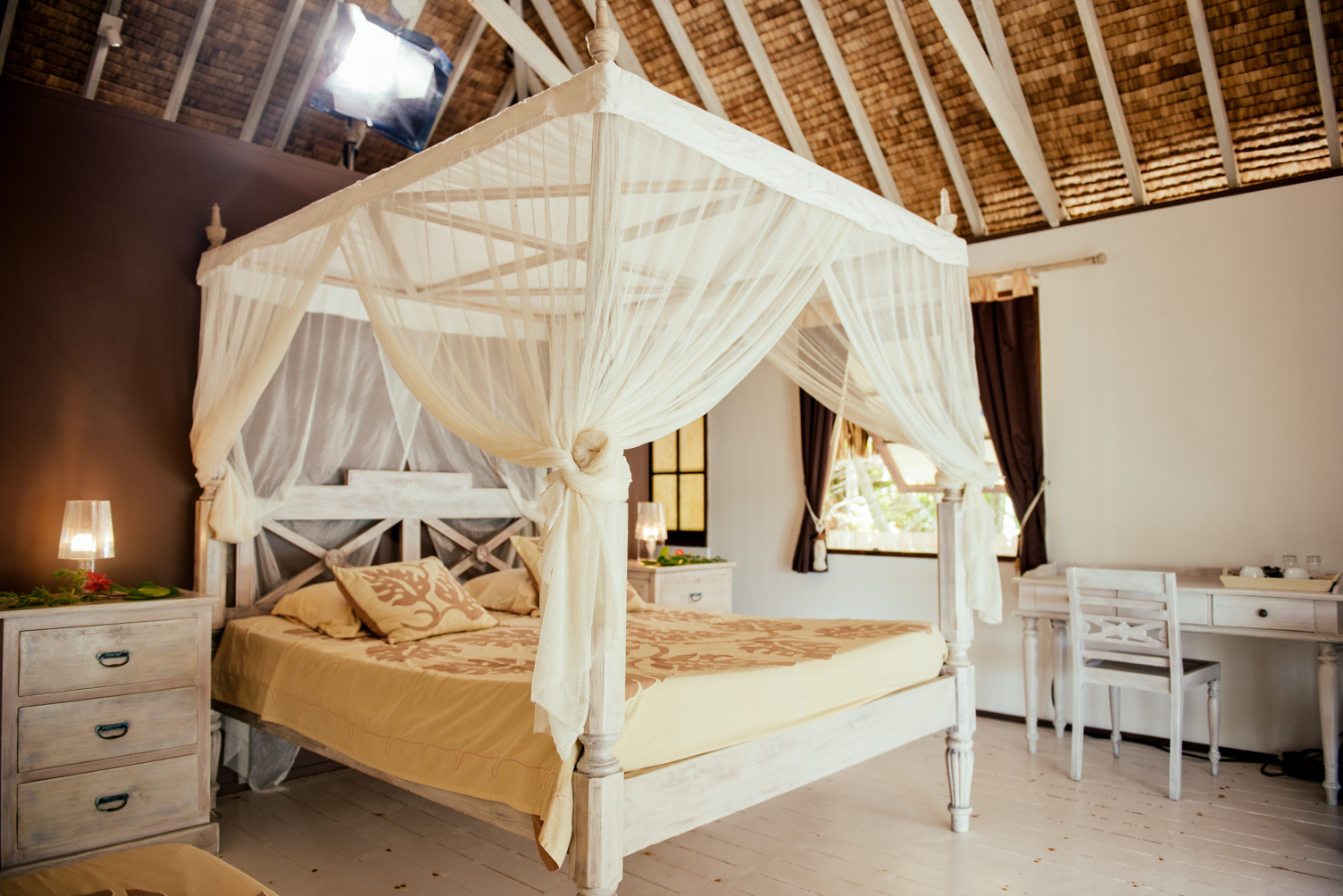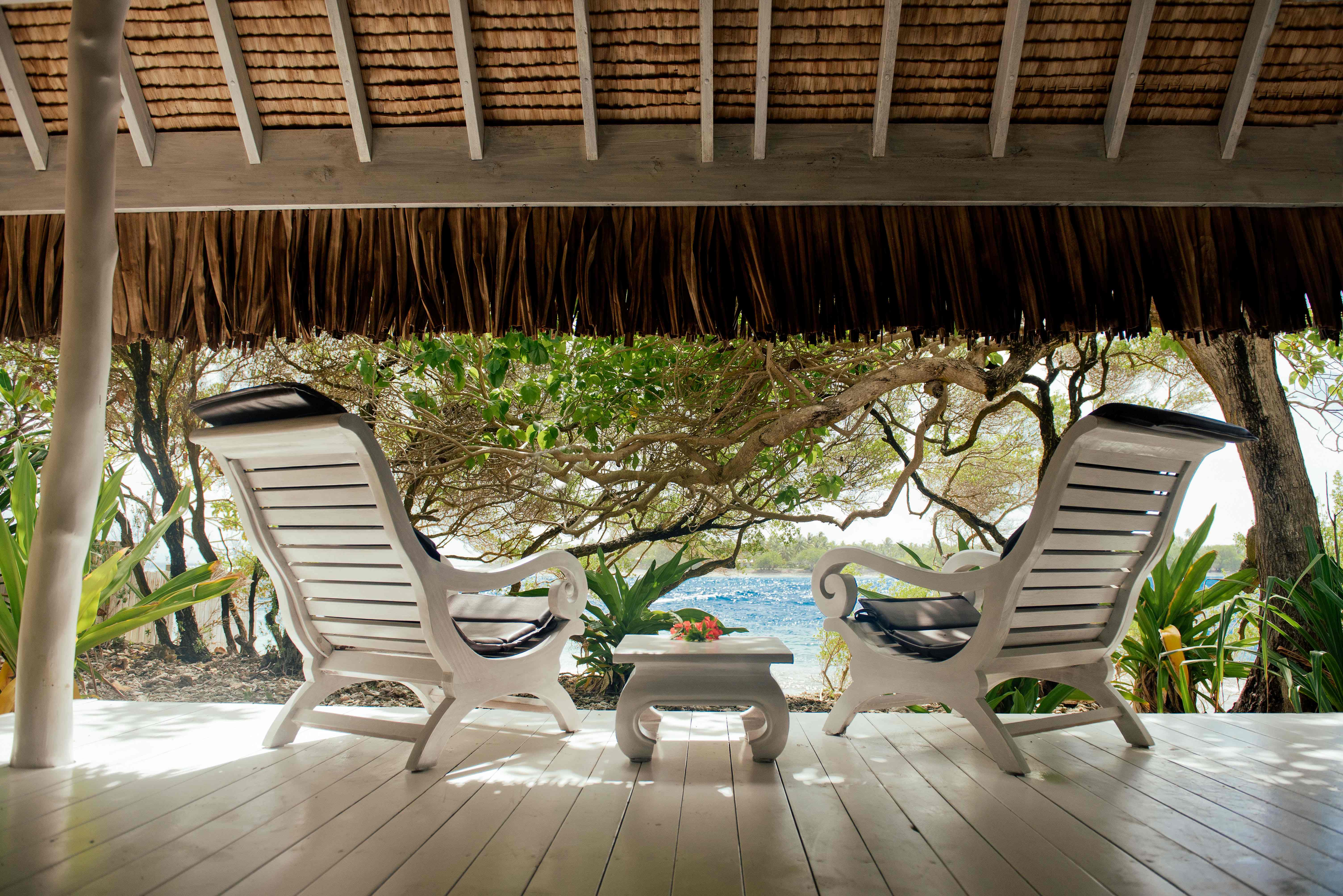 Les quatre autres bungalows sont nichés au cœur d'un jardin tropical luxuriant et aménagé. Plus au calme, ils offrent une atmosphère sereine et intime, entourée de la végétation spécifique aux atolls. Bien qu'ils n'offrent pas une vue directe sur la passe, leur cadre verdoyant et paisible est parfait pour se ressourcer en toute tranquillité.