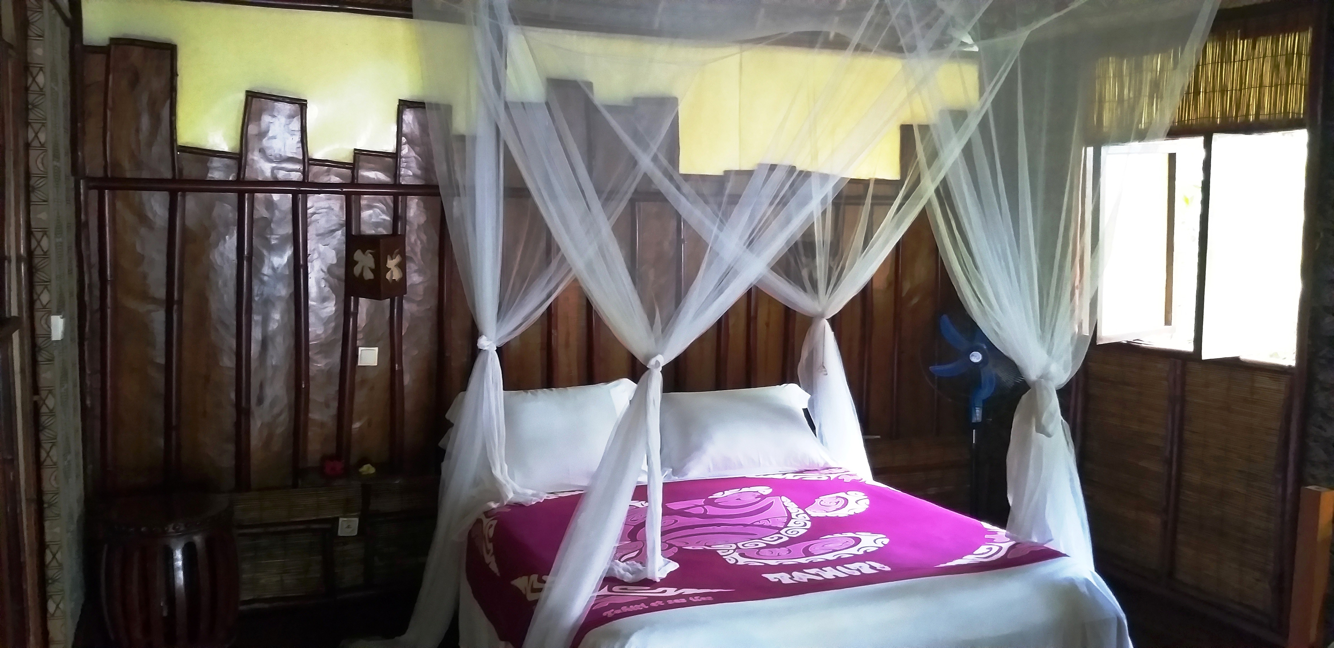 Ce bungalow dispose de nombreuses commodités, dont un lit double 160 x 200 équipé d'une moustiquaire, un coffre-fort, un bureau et une superbe salle de bain.